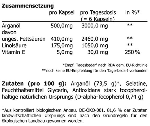Arganöl: 500,0mg davon unges. Fettsäuren: 410,0mg Linolsäure: 175,0mg Vitamin E: 5,0 mg