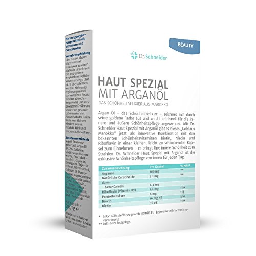Arganöl – das Schönheitselixier – zeichnet sich durch seine goldene Farbe aus und wird traditionell für die innere und äußere Schönheitspflege angewendet. Mit Dr. Schneider Haut Spezial mit Arganöl gibt es dieses “Gold aus Marokko” jetzt in einer speziellen Kombination mit den bekannten Schönheitsvitaminen Biotin, Niacin und Riboflavin, die zum Erhalt der gesunden Haut beitragen. Dank der kleinen, ovalen Form ist die Kapsel gut zu schlucken, was die tägliche Einnahme erleichtert – es bringt Ihre innere Schönheit zum Strahlen. Dr. Schneider Haut Spezial mit Arganöl ist die exklusive Schönheitspflege von innen für jeden Tag.