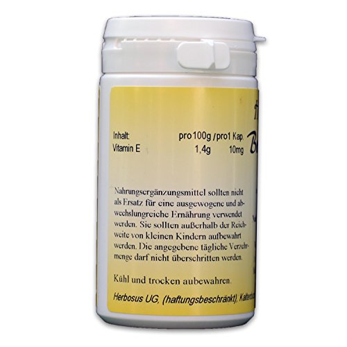 Nährwertangaben 100 g / 1 Kap.: Brennwert 3037,1kJ / 21,7kJ; Brennwert 723,1kcal / 5,2kcal; Eiweiß 17,9 g / 127,7 mg; Kohlenhydrate 7,1 g / 50,7 mg; Fett 70,6 g / 504,9 mg; Vitamin E 1,4 g / 10 mg