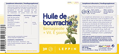 1 Kapsel enthält: Borretsch-Öl 500 mg, Vitamin E (als D Alpha Tocopheryl) (Vit E 41, 5% *). Beitrag von Referenz