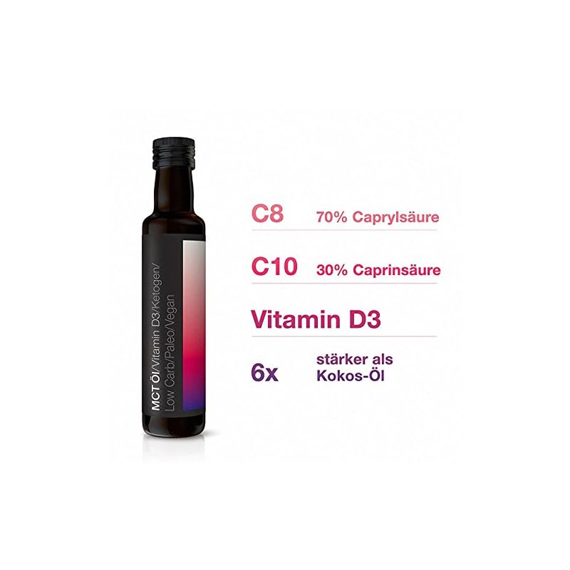 Gib Dich nur mit dem Besten zufrieden. Das Premium-MCT Öl von Violeum wird hergestellt aus hochwertigen Kokosnüssen und enthält neben gesunden Capryl- und Caprinsäuren zusätzlich wichtiges Vitamin D3. MCT Öl wird vom Körper besser absorbiert als andere Fette und hilft somit beim Transport von Mineral- und Vitalstoffen im Körper. Zudem unterstützt es den ketogenen Fettstoffwechsel und ist damit besonders förderlich für aktives Gewichtsmanagement und Konzentrationssteigerung.