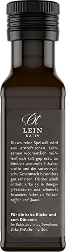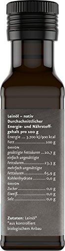 Dieses reine Speiseöl wird aus erntefrischen Leinsamen wöchentlich mühlenfrisch kalt gepresst. So bleiben wertvolle Inhaltsstoffe und der sortentypische Geschmack besonders gut erhalten. Frisches Leinöl enthält zirka 55% Omega-3 Fettsäuren und ist besonders lecker zu Pellkartoffeln und Quark. Herstellung Leinöl wird aus erntereifer brauner Leinsaat (Linum usisatissimum) täglich kalt gepresst (37 °C), druckfrei schonend filtriert und unter Vakuum mühlenfrisch abgefüllt. Eine rasche und schonende Verarbeitung schützt das kostbarste aller Pflanzenöle vor Licht und Sauerstoff am besten. Wegen seines hohen Gehaltes an omega-3-Fettsäuren (ca. 60 %) verbessert der regelmäßige Verzehr von Leinöl das durchschnittliche Verhältnis von omega-6 zu omega-3 Fettsäuren (12:1) in unserer Nahrung zugunsten der omega-3 Fettsäure (alpha-Linolensäure). Schon bei bei regelmäßiger Einnahme von nur 1 -2 Esslöffel Leinöl pro Tag (10 g) trägt dies zur Aufrechterhaltung eines normalen Cholesterinspiegels im Blut bei. Leinöl stets gut gekühlt aufbewahren. So bleiben die wertvollen Inhaltsstoffe und der typisch nussig-herbe Geschmack besonders gut erhalten. Ungekühlt ist Leinöl nur 2 Monate haltbar, bei Kühl- oder Gefrierlagerung um Wochen und Monate länger. Das Leinöl verändert sich nämlich durch die Kühlung oder das Einfrieren nicht und behält seine bekömmlichen und wohltuenden Eigenschaften bei. Verwendung Leinöl wird gern mit Pellkartoffeln und Kräuterquark zubereitet. Es eignet sich auch als Zutat für frische Gemüsesäfte, gedünstetes Gemüse, Salatdressings, Dipps, Milchdrinks und Müsli – aber nicht für die heisse Küche oder zum Frittieren! reich an omega-3 Fettsäuren (ALA 55%) ; ALA* trägt zur Aufrechterhaltung eines normalen Cholesterinspiegels im Blut bei.