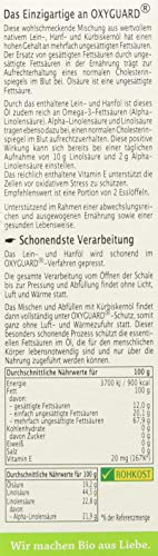 Das Lein- und Hanföl wird schonend im OXYGUARD-Verfahren gepresst. Die gesamte Verarbeitung vom Öffnen der Schale bis zur Pressung und Abfüllung findet ohne Licht, Luft und Wärme statt. Das Mischen und Abfüllen mit nativem Kürbiskernöl findet dann vollständig unter OXYGUARD-Schutz, somit ganz ohne Luft – und Wärmezufuhr statt.