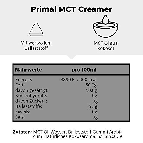 🥥 CREMIGES MCT ÖL: Primal MCT Creamer ist ein emulgiertes MCT Öl aus 100% Kokosnüssen und enthält die drei Fettsäuren, 45% Caprylsäure (C8), 27% Caprinsäure (C10), und 28% Laurinsäure (C12)